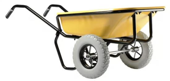 Brouette bi-roues Haemmerlin Expert Twin Excellium 160 L peinte jaune avec caisse nervurée 6 trous. 2 roues increvables Ø 400 mm PF 38 jantes métal à rayons et roulements à rouleaux, châssis tube peint noir formant butoir et jonc de soutien, poignées bi-matière ergonomiques.