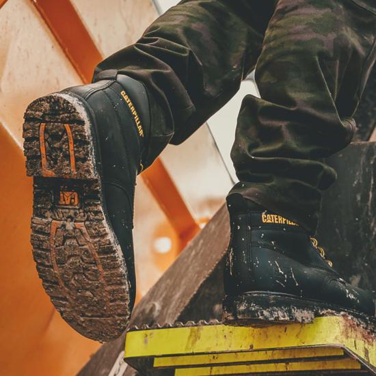 Chaussure Haute Caterpillar Powerplant S3 HRO SRA testée en conditions réelles : semelle résistante 300 °C contact direct confirmée, adhérence SRA optimale sur sols humides, protection anti-perforation acier efficace pour une sécurité accrue sur chantier.