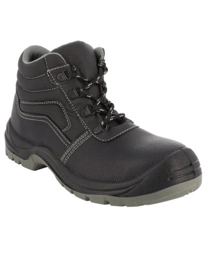 La chaussure haute de sécurité Singer GR350 en cuir grainé hydrofuge noir et gris est la chaussure montante robuste et résistante à l’eau pour les professionnels en environnement humide : embout et insert anti-perforation en acier, semelle PU double densité résistante hydrocarbures et adhérence SRC.